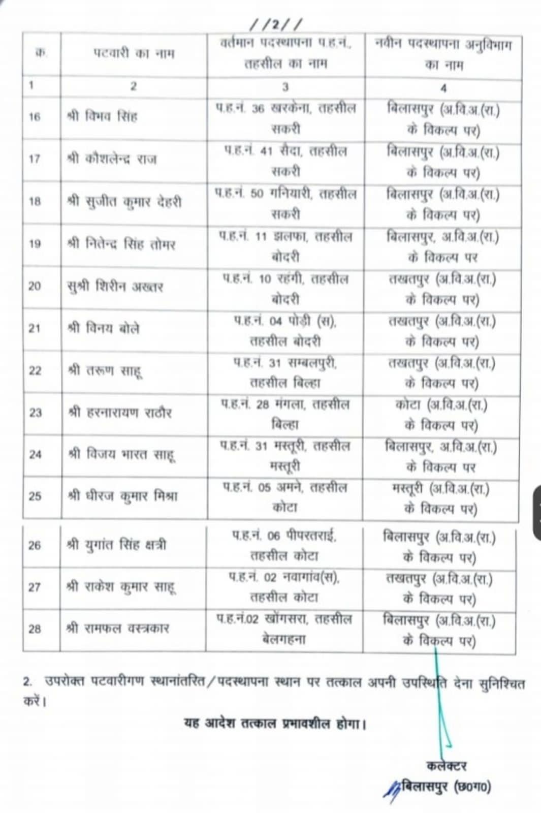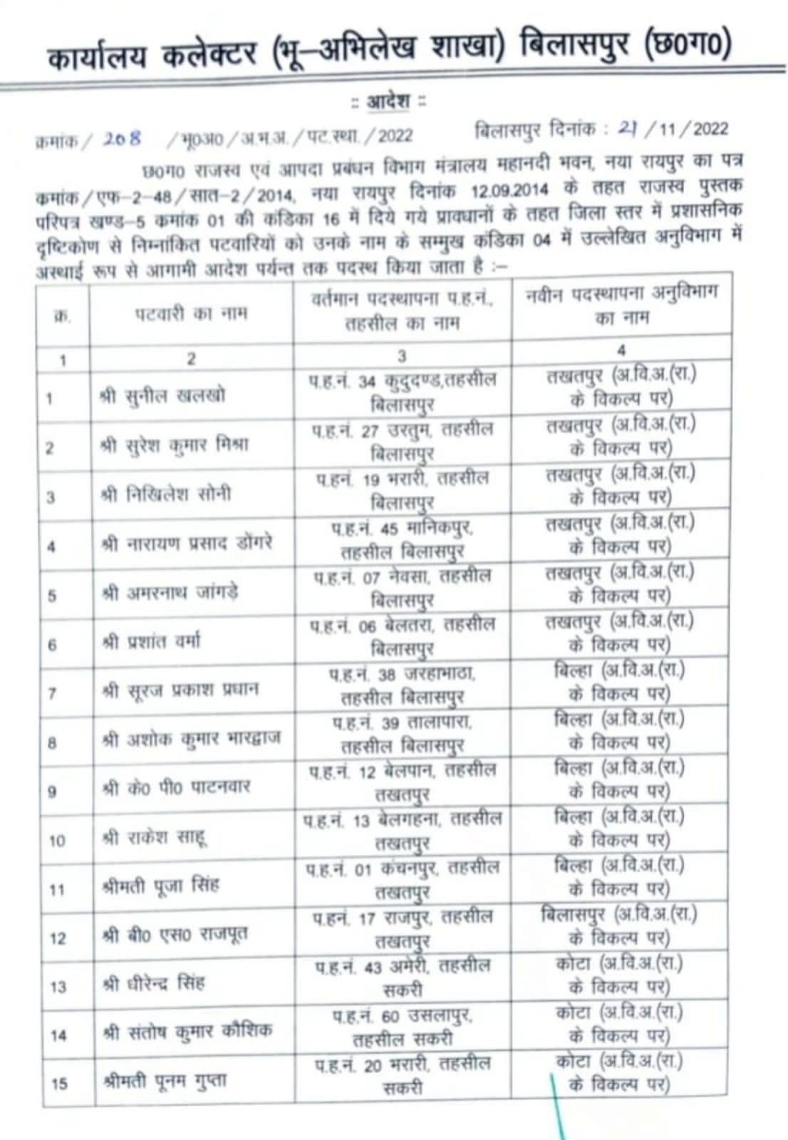 ( वरुण सिंह ) : तखतपुर : कलेक्टर ने किया तखतपुर पटवारियों का ट्रांसफर, देखें सूची,