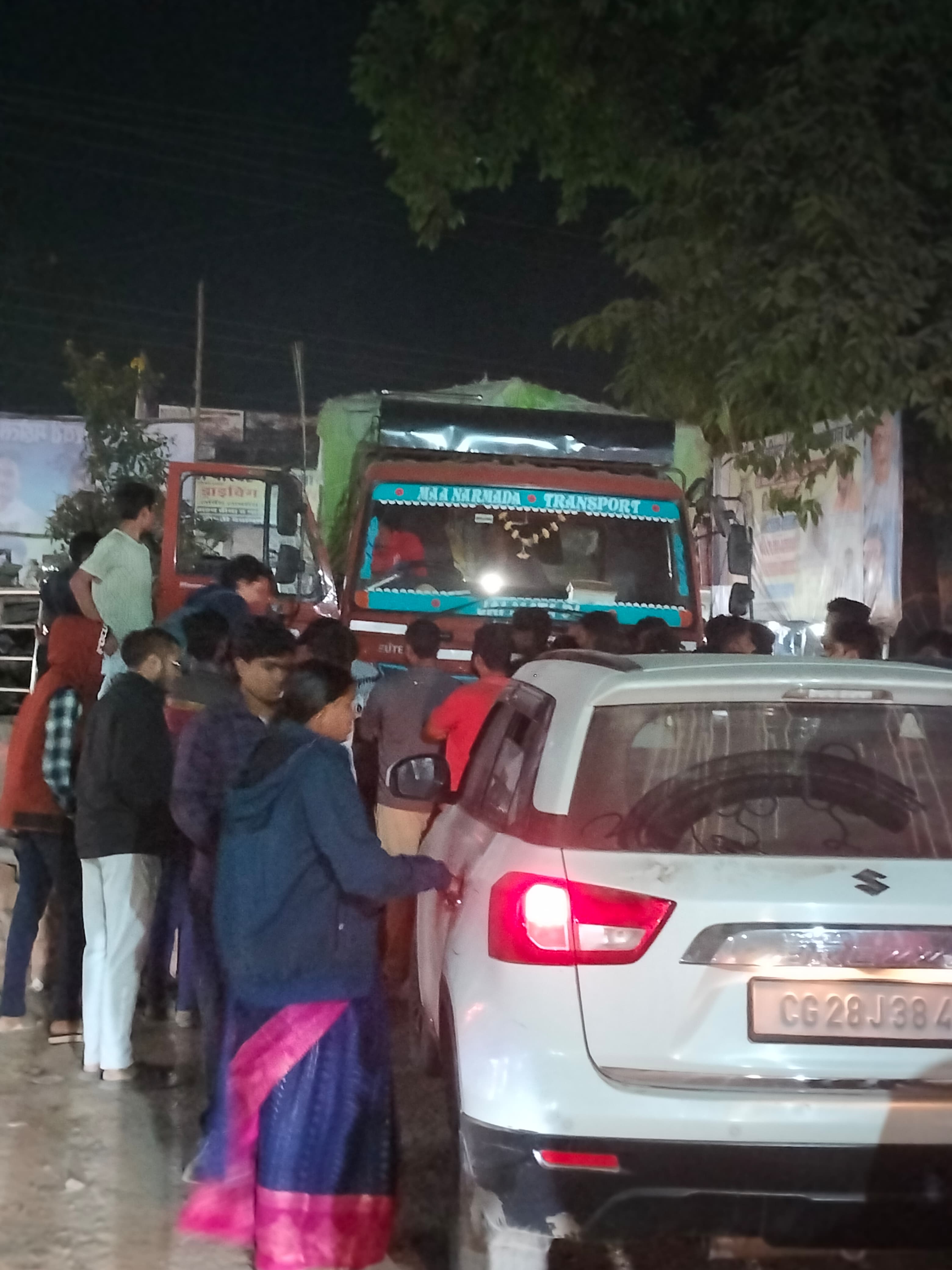 नंबर प्लेट : CG 28 J 3843 पीले रंग की नंबर प्लेट वाला एक ट्रक/भारी वाहन (आगे से क्षतिग्रस्त प्रतीत होता है):